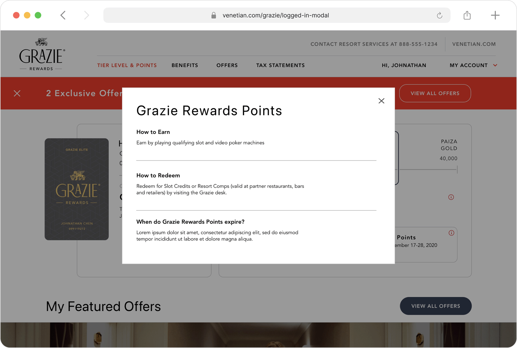 A membership portal experience for Grazie members that helped Venetian retain and grow their membership base and improve the flow of point redemption across their Venetian assets.